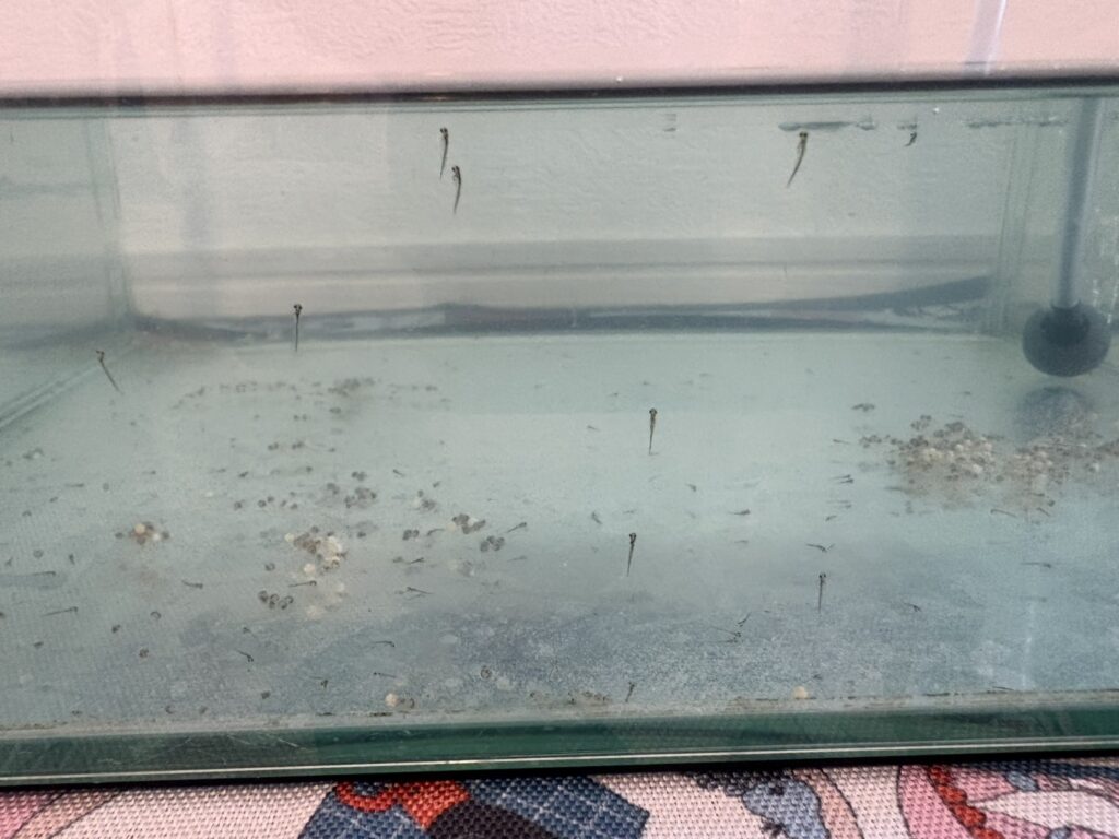 稚魚は3日間はエサ不要です、というのも稚魚にはヨークサックと呼ばれる栄養塊が付いているので、それを消費して生き残るんです。