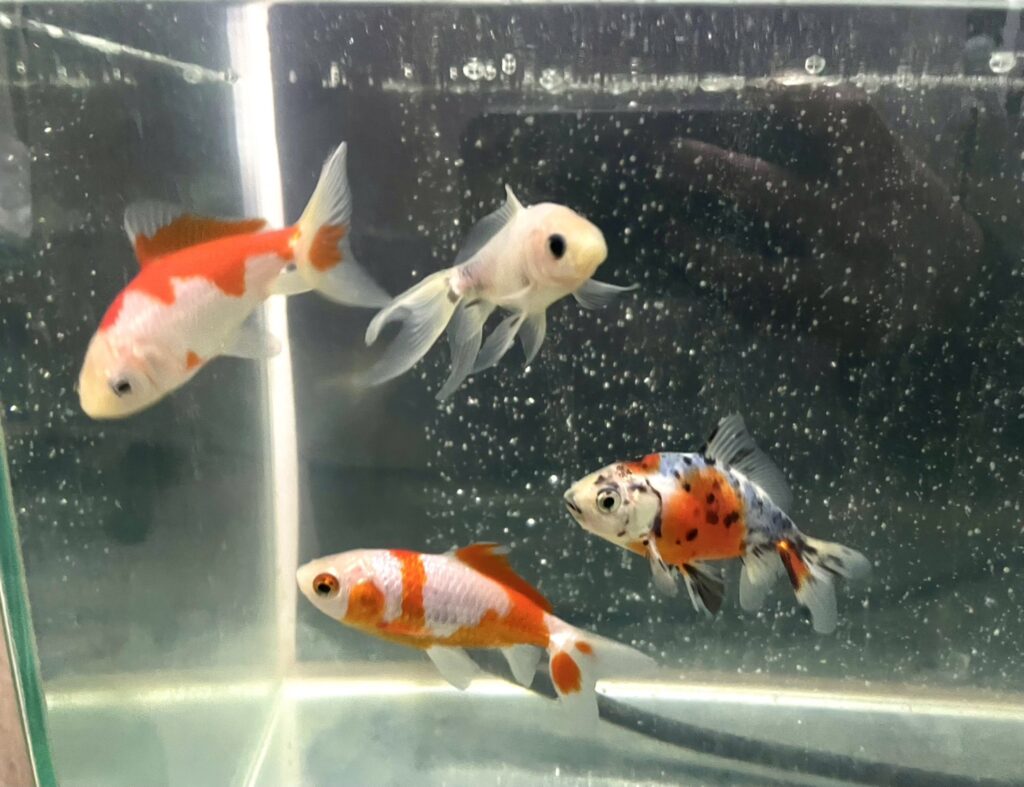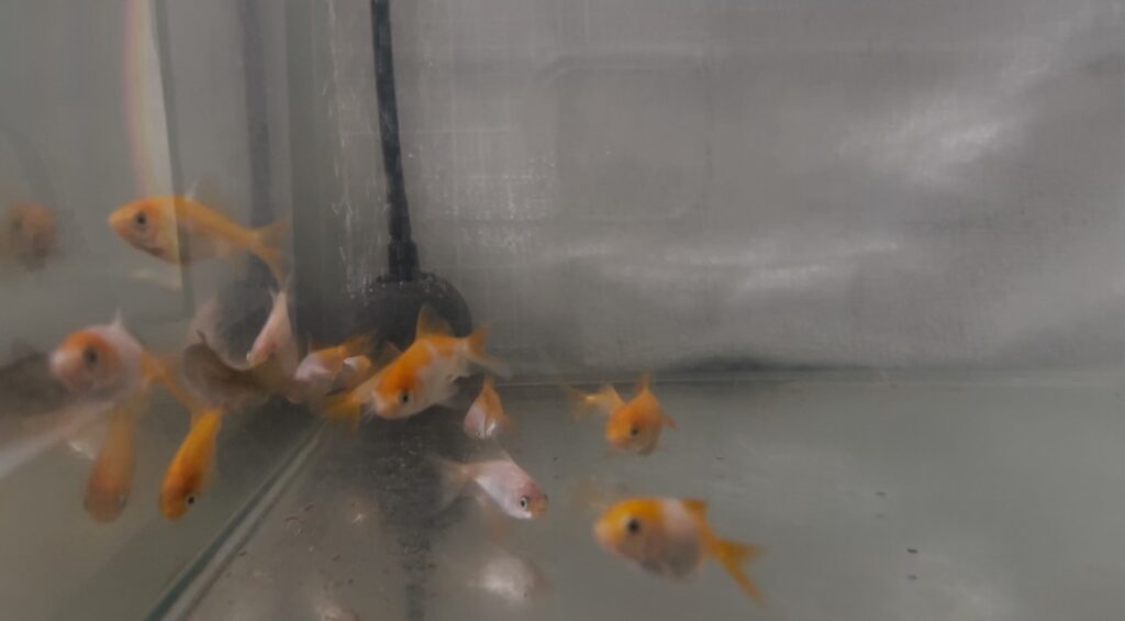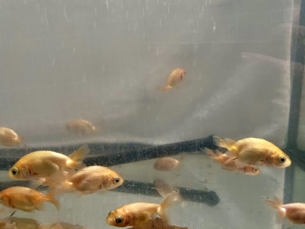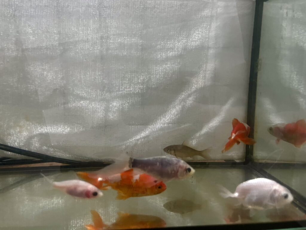 5月中旬に生まれた稚魚、購入したランチュウの稚魚、いただいた鉄魚の稚魚、二歳の長物。