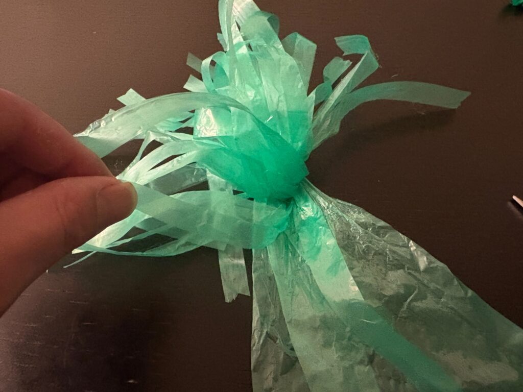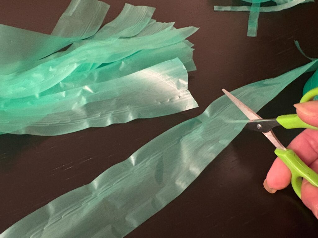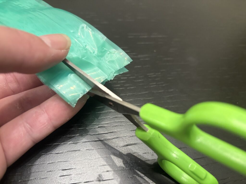 ビニール紐束の反対面を切り揃え、縦に切り込みを入れていきます。