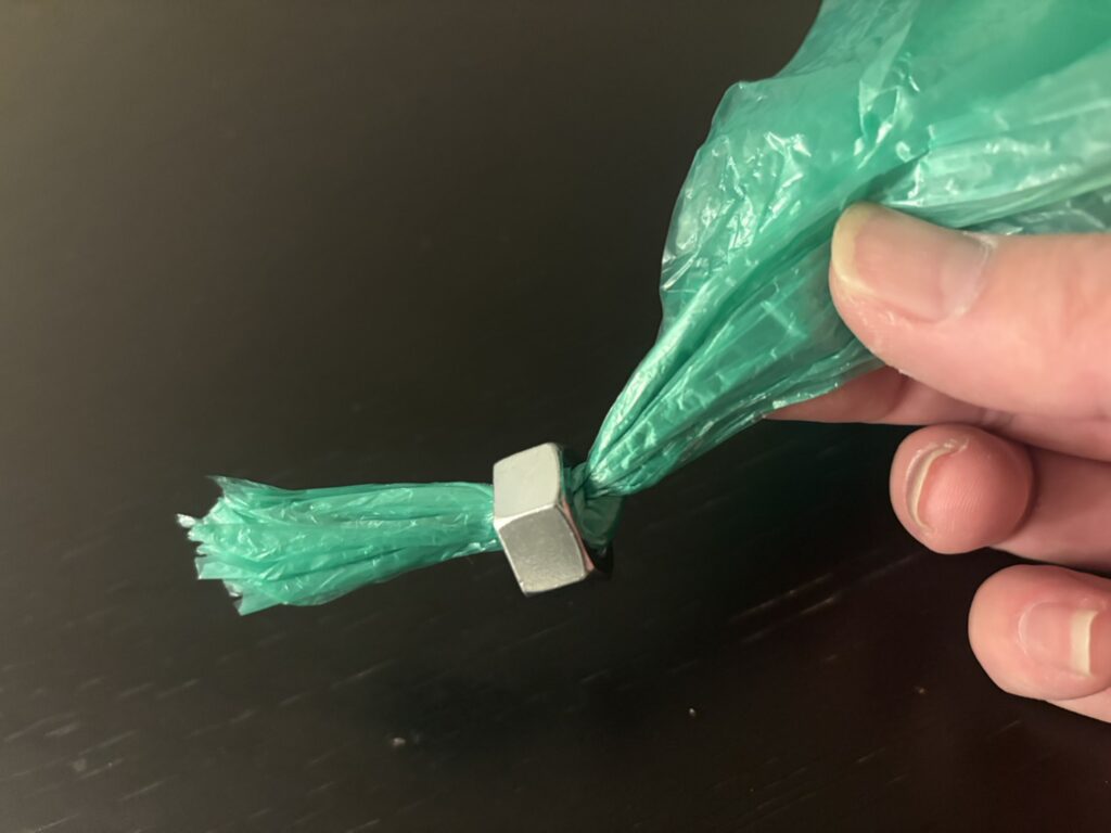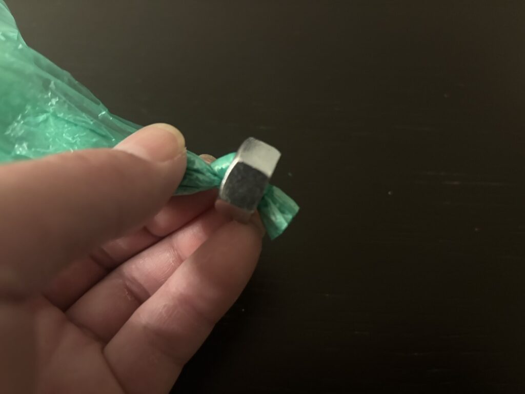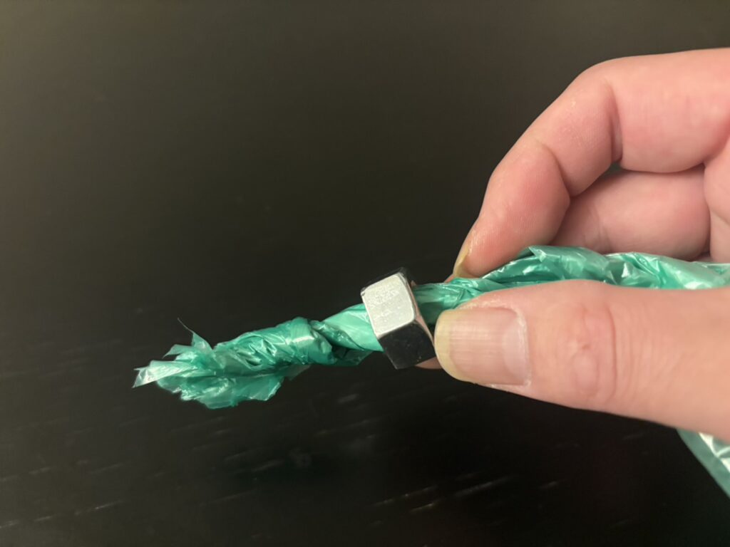 ナットの穴にビニール紐を通します。
