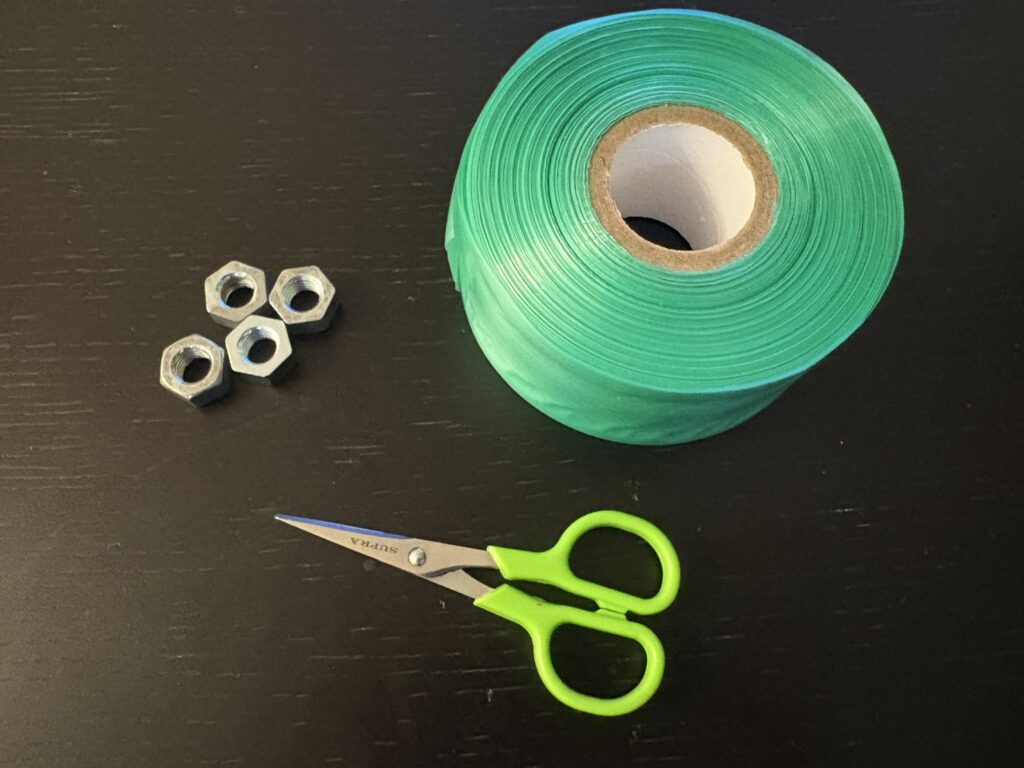 用意するものは、ビニール紐、ナット、ハサミです。